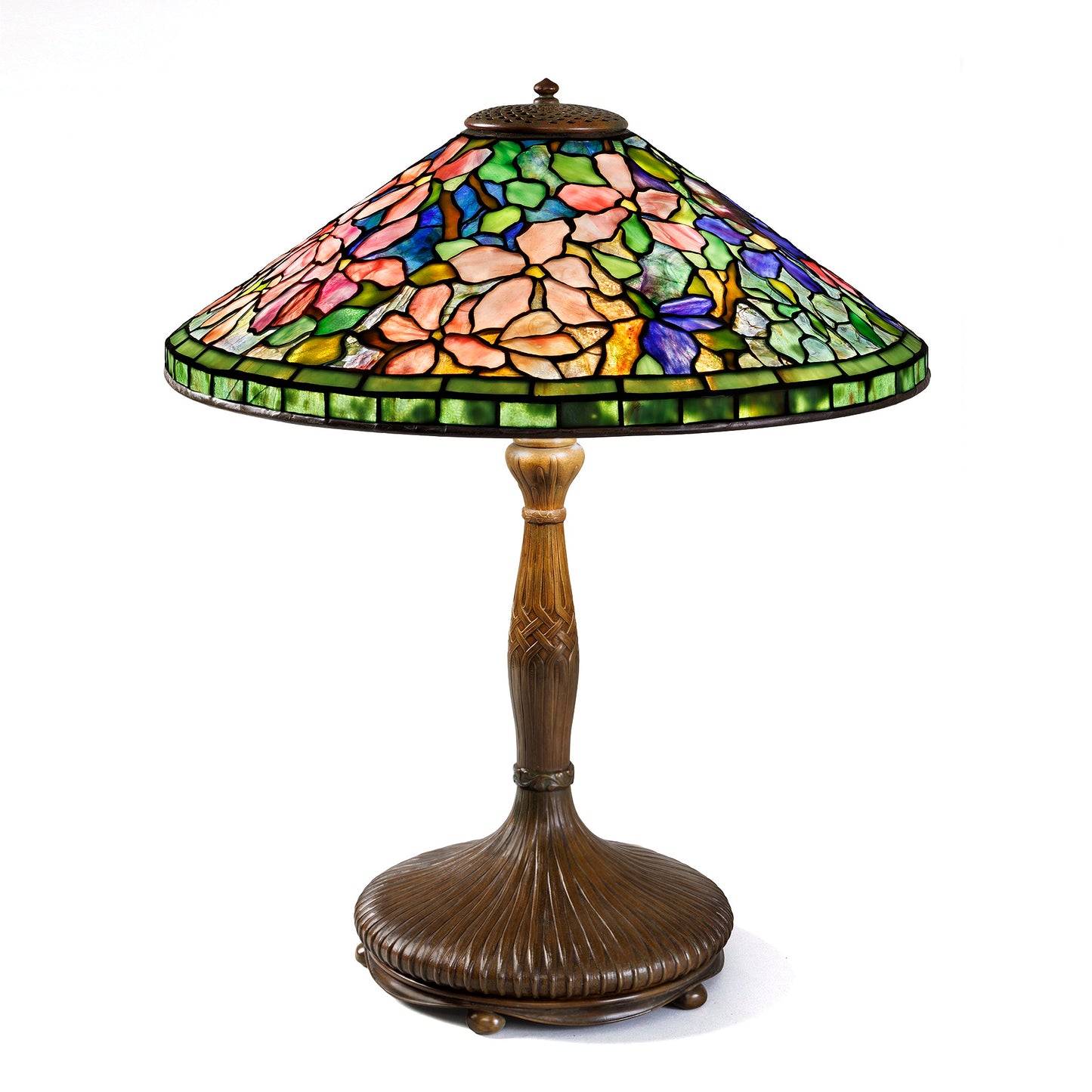 Tiffany’s Clematis shade displays blossoms in radiant tones of pink, purple, blue, and green set against a background of richly mottled confetti glass in complementary hues. Louis C. Tiffany held a particular fondness for the clematis—a native climbing vine that framed one of the fountains at his Laurelton Hall estate. Long associated with the charm of the old-fashioned cottage garden, the clematis also resonated with the ideals of the Colonial Revival movement. The shade rests on a base adorned with a complex, radially symmetrical grass-basket motif that rises in interlaced patterns along the stem before unfolding into fiddlehead ferns. Each blade is finely engraved with lateral veins, revealing both remarkable naturalistic precision and Tiffany’s deep sensitivity to botanical form.